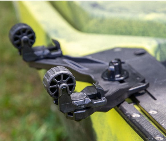 Like the DoubleHeader and its other variations, the LeaderBoard DoubleHeader offers the user a 3.5” offset from a single point of attachment so as not to tie up valuable track space or block the gunnel of your kayak, allowing for the full functionality of other accessories. As mentioned above, the redesigned RotoGrips featured on this DoubleHeader are unique to the shape of the LeaderBoard. Insert the underside of the LeaderBoard into the hooked side of the RotoGrip and rotate the board towards the wheels until it is in a vertical orientation and locked into place. The LeaderBoard will only release in one direction to prevent you from accidentally knocking it out into the water. To release and remove the LeaderBoard, roll the board away from the RotoGrip wheels towards the hooks, and the board will come out with ease.